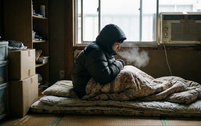 古い木造アパートで、ショウさん(仮名・20歳)は布団の中で小さく体を丸めていました。 室内にもかかわらず、厚手のダウンジャケットを着込み、フードを深くかぶり、マフラーまで巻いています。吐く息は白く、枕元の水は冷え切っています。
