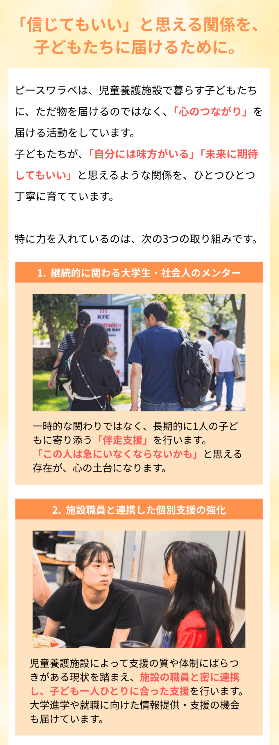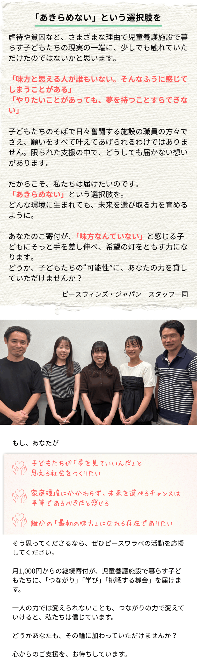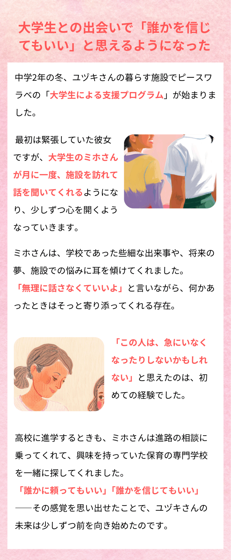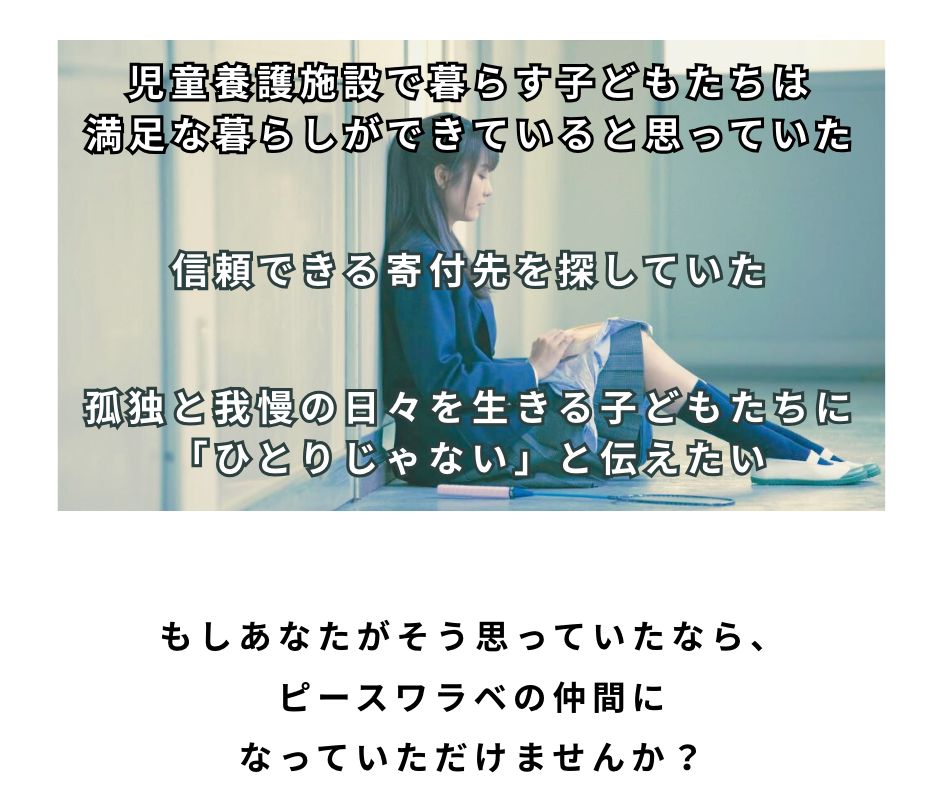 これまでピースワラベの「メンター支援」や「進路・体験サポート」といった、児童養護施設で暮らす子ども一人ひとりに寄り添う取り組みに共感し、応援してくださった皆さまと共に、たくさんの子どもたちの今と未来を支えてきました。