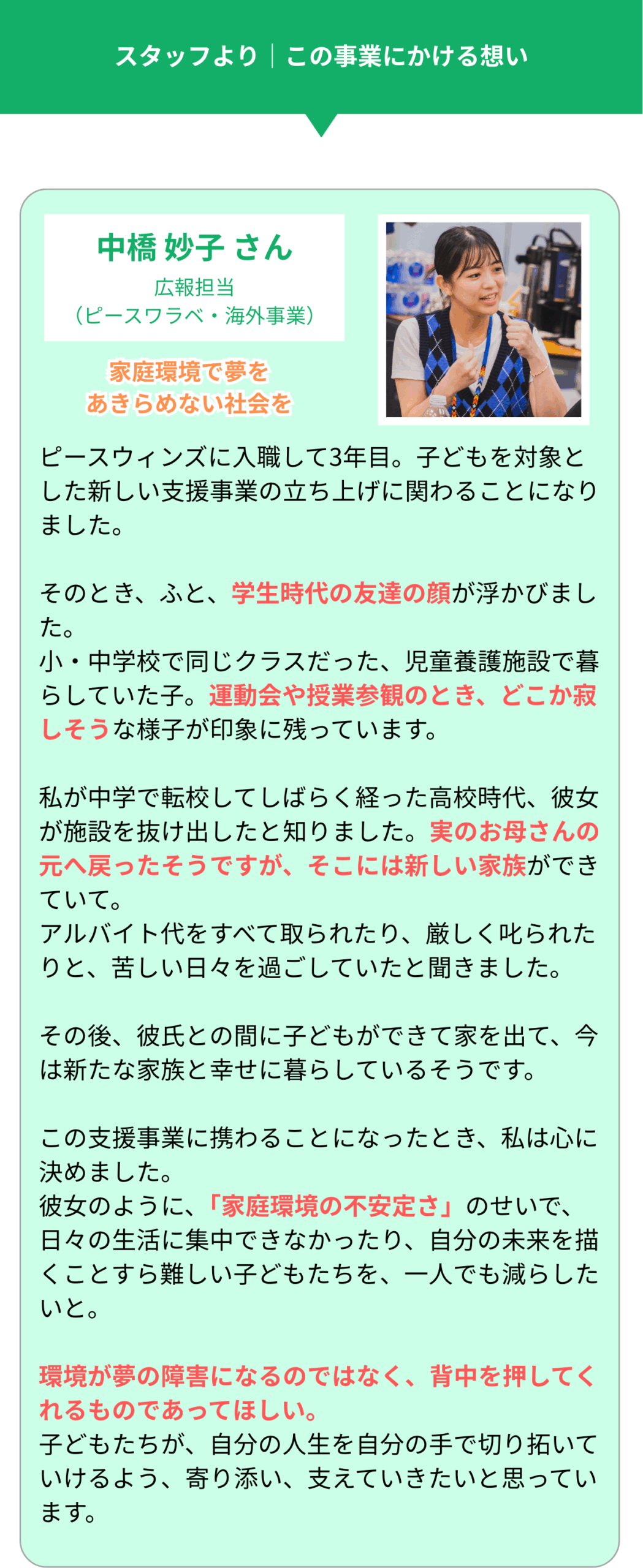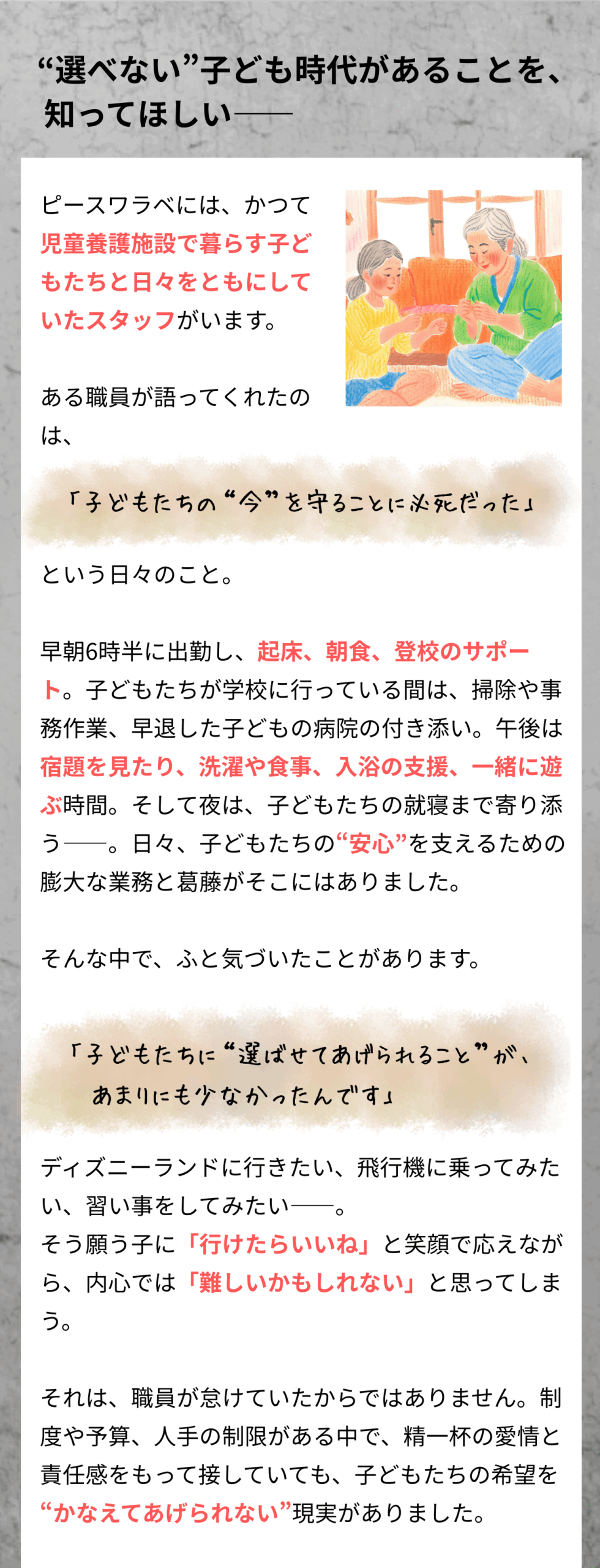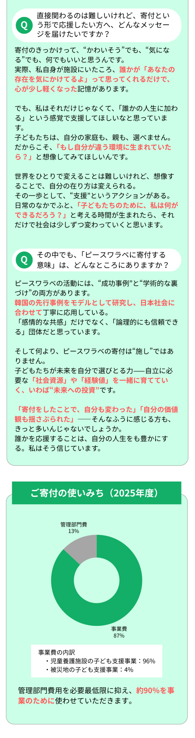 これまでピースワラベの「メンター支援」や「進路・体験サポート」といった、児童養護施設で暮らす子ども一人ひとりに寄り添う取り組みに共感し、応援してくださった皆さまと共に、たくさんの子どもたちの今と未来を支えてきました。
