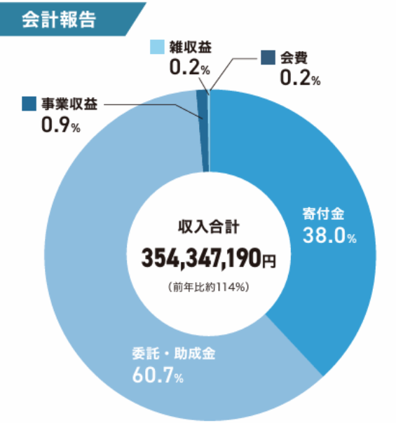 アクセプト・インターナショナルが公式ホームページ上で公開している「2024年度 活動報告書」を確認すると、寄付金が収益の約38%を占めていることが分かります。