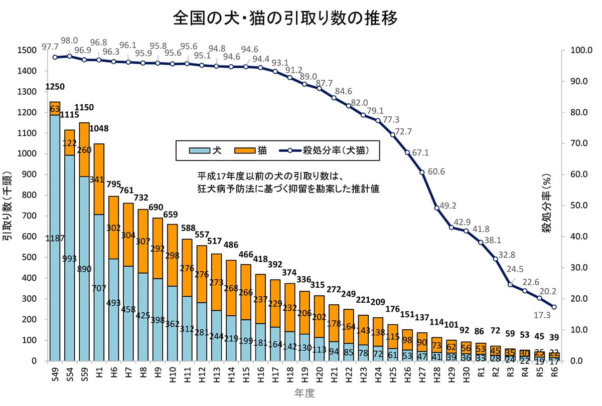 出典:環境省統計資料 「犬・猫の引取り及び負傷動物等の収容並びに処分の状況」