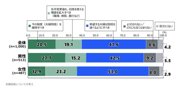 一方で、民法が定める夫婦同姓の現行制度を「維持すべき」とする意見は全体の約2割にとどまり、女性では1割強に過ぎません。